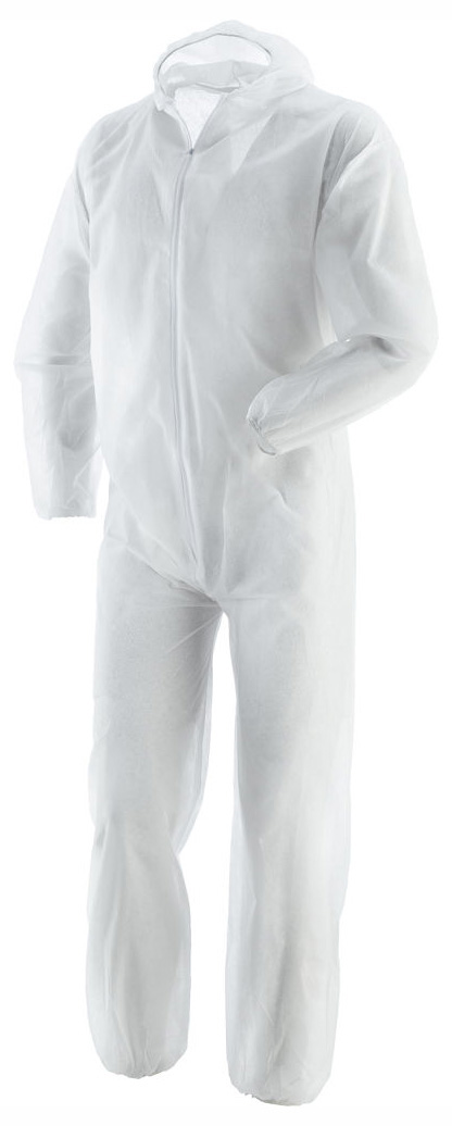 in polipropilene. Peso 40 g/mq Monouso. Ipoallergenica. Elastici senza lattice. Chiusura con cerniera. CE Ia categoria Taglia XL Colore bianco