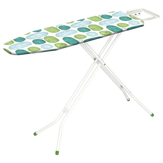 Mod. ROY struttura in tubolare di acciaio verniciato diametro 22 mm Piano in rete cm 122×38, regolabile in altezza. Poggiaferro in lamiera verniciata. Foderina in cotone 100% con spugna. Completo di griglia portabiancheria